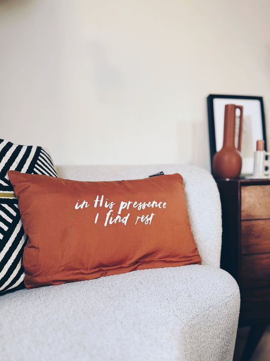 Kussensloop - in His Presence I find rest - Luxe Katoen - Cognac
